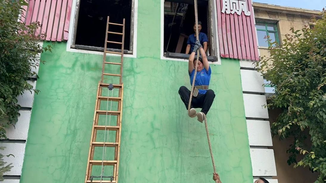 在训练塔下,消防员细致讲解云梯攀登的要领与安全要点。训练实操让成员们切身感受到消防员的专业素质与坚持不懈精神,更深切体会到消防员用自己的生命守护人民生命财产安全的无私奉献精神。