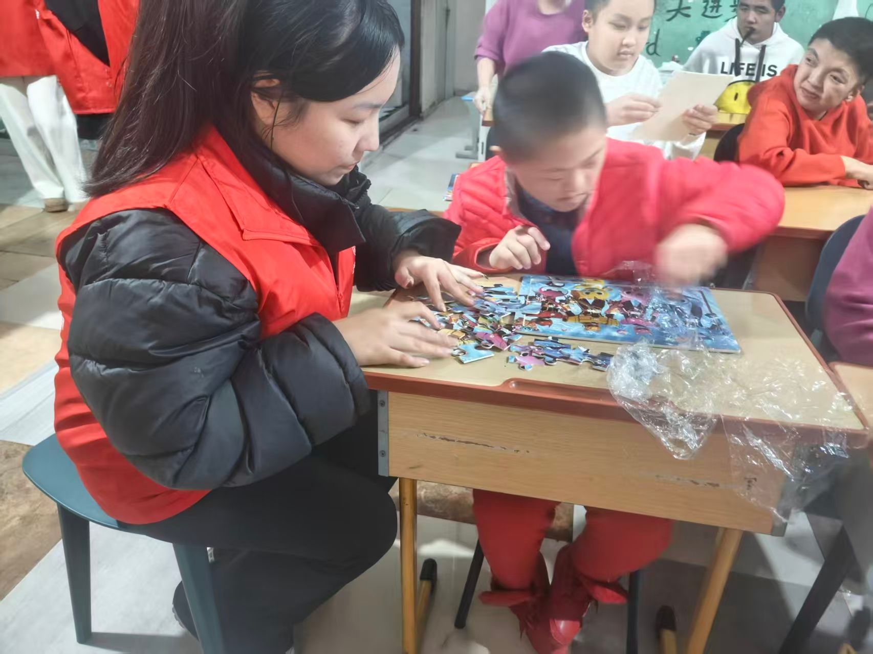 活动伊始,服务站陪护老师详细介绍了孤独症儿童的认知特点、行为习惯及陪伴注意事项,为志愿者们开展服务提供了专业指导。随后,志愿者们结合儿童兴趣,精心设计了唱歌互动、拼画创作、趣味游戏等多样化活动,在欢快的歌声中拉近距离,在色彩的碰撞中激发创意,在轻松的游戏中传递信任。志愿者们耐心引导、真诚交流,一点点尝试走进孩子们封闭的内心世界,用掌心的温度和温柔的话语,让孩子们感受到久违的陪伴与关怀。