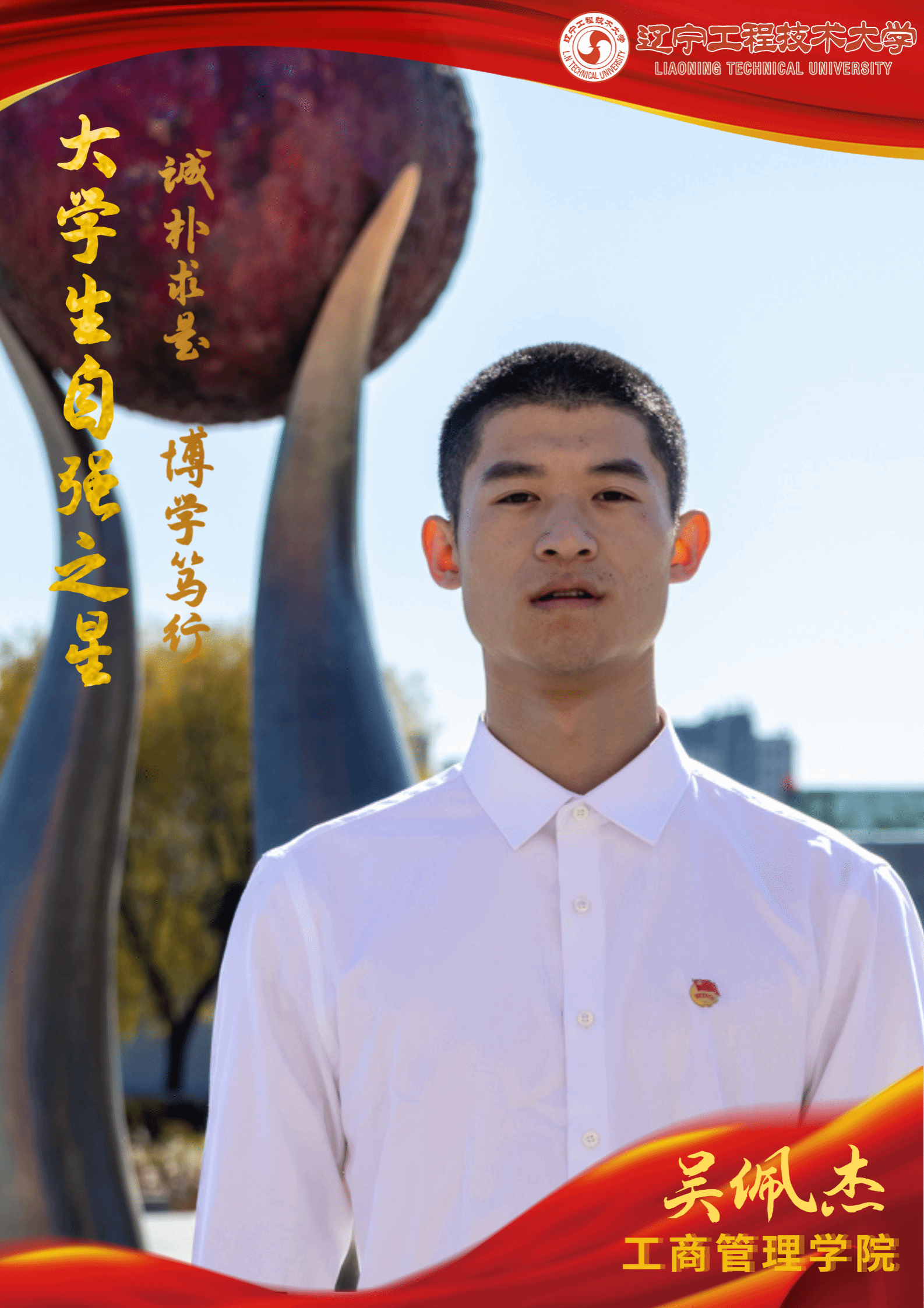 吴佩杰,男,2003年3月出生,共青团员,辽宁工程技术大学工商管理学院2022级工程管理专业4班学生。2024年9月被确定为入党积极分子,现处于学院发展对象考核阶段。自入学以来,他始终秉持“勤学笃行,求真务实”的信念,以其优异的学习成绩、扎实的科研能力、积极的实践精神和担当奉献的品质,生动诠释了新时代青年大学生自强不息、追求真理的风采。